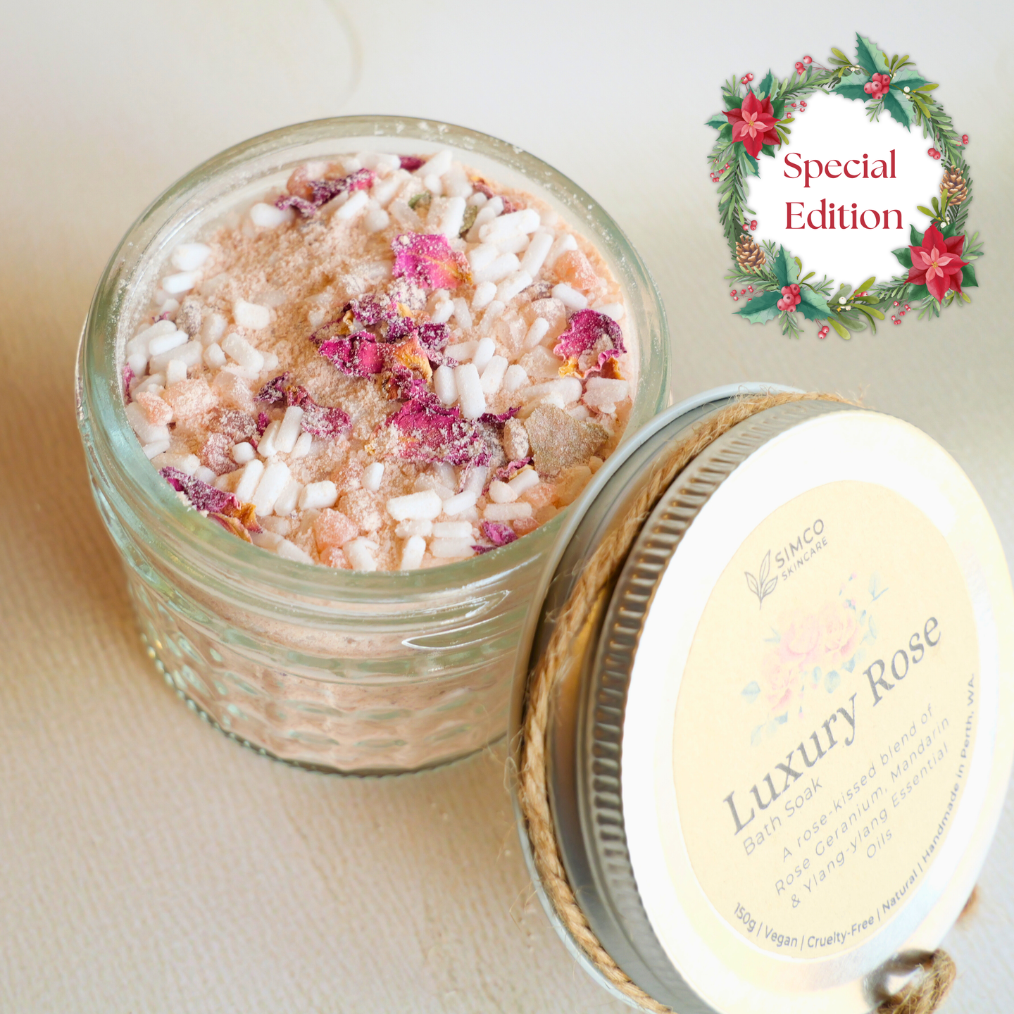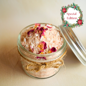 Pink Himalayan salt, Epsom salt, Baking soda, Arrowroot powder, Colloidal oatmeal, French pink clay, Dried rose petals, Essential oils (Rose Geranium, Mandarin, Benzoin, Ylang-ylang).