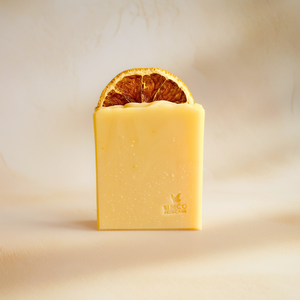 A bright-cosy holiday bar. Orange Ember pairs juicy, sweet orange with a warm pinch of cinnamon, softly grounded by benzoin. Two creamy layers swirled together, finished with a dried orange slice on top. Vegan base. Festive vibe.